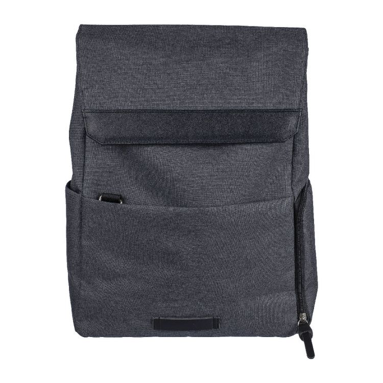 Laptop-Rucksack aus 600D Polyester-Gewebe (15 Zoll) mit PVC-Details und 210D-Futter. Ausgestattet mit einer kleinen Fronttasche mit Reißverschluss und Karabinerhaken für Schlüssel, einer Seitentasche mit Reißverschluss, einer normalen Seitentasche und einer großen Tasche mit Magnetverschluss und Laptop-Fach. Seitliche Druckknöpfe zum Verschließen des Rucksacks, wenn er nicht vollständig gefüllt ist. Verstellbare, belüftete Schultergurte. Mit rPET-Etikett auf der Vorderseite.