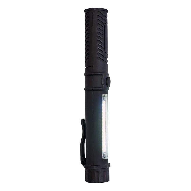 Arbeitslampe aus Kunststoff, mit runder COB-Leuchte vorne und einem COB-Leuchtstreifen an der Seite, Magnet und Kunststoffclip.