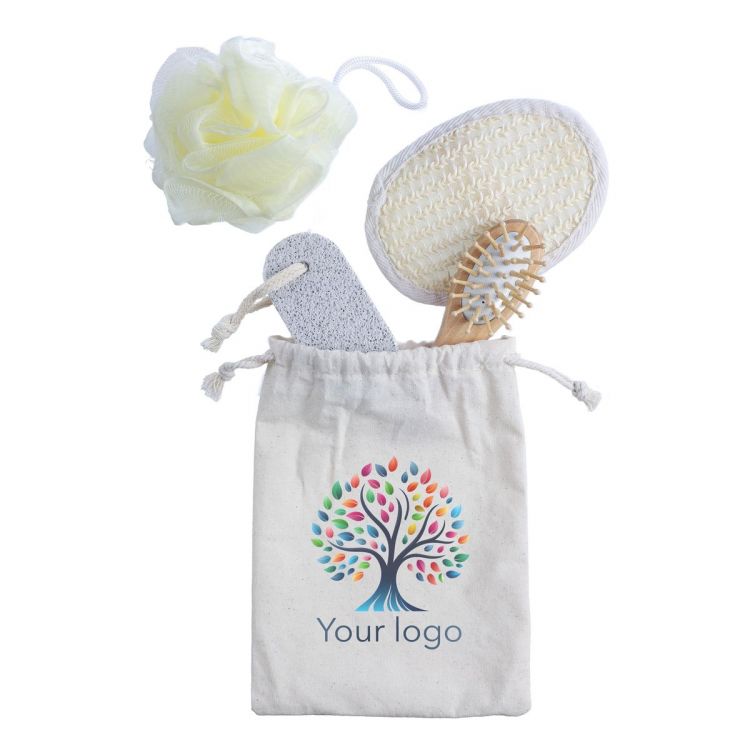 4-teiliges Badeset aus Baumwolle: Bambusbürste, weicher Schwamm, Scheuerschwamm und Bimsstein (im Beutel). Einzeln verpackt im Baumwollbeutel.