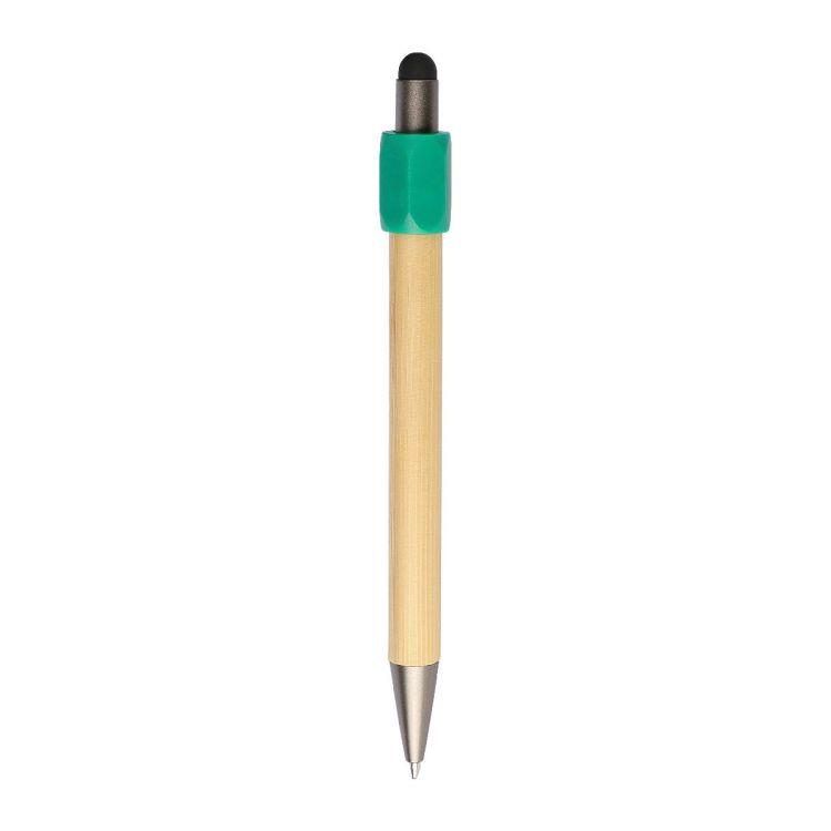 Kugelschreiber aus Bambus mit Drehmechanik aus recyceltem ABS und schwarzer Stiftspitze am Drücker. Ausgestattet mit Druckmechanik, 1,0 mm Mine und blauer Tinte mit einer Strichlänge von ca. 800 m. Mit Reycling-Logo.