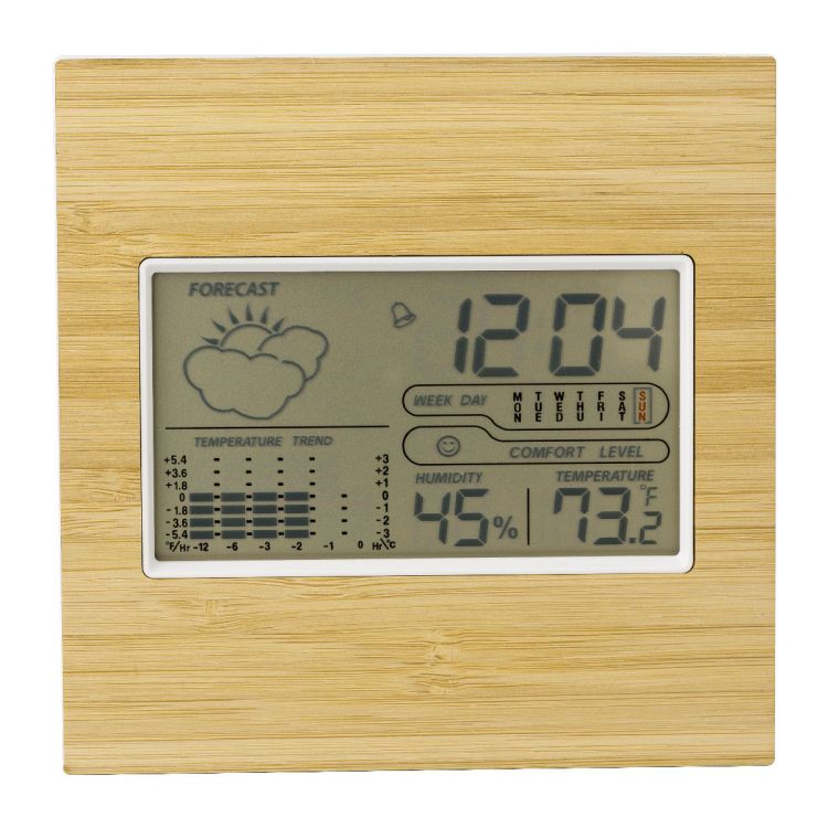 Wetterstation aus Bambus, ABS und Glas mit einstellbarem Ständer. Funktionen: Uhrzeit, Kalender, Wochenübersicht, Alarm und Schlummerfunktion, Temperatur, Luftfeuchtigkeit und Wetterinformationen. Inklusive Batterien.