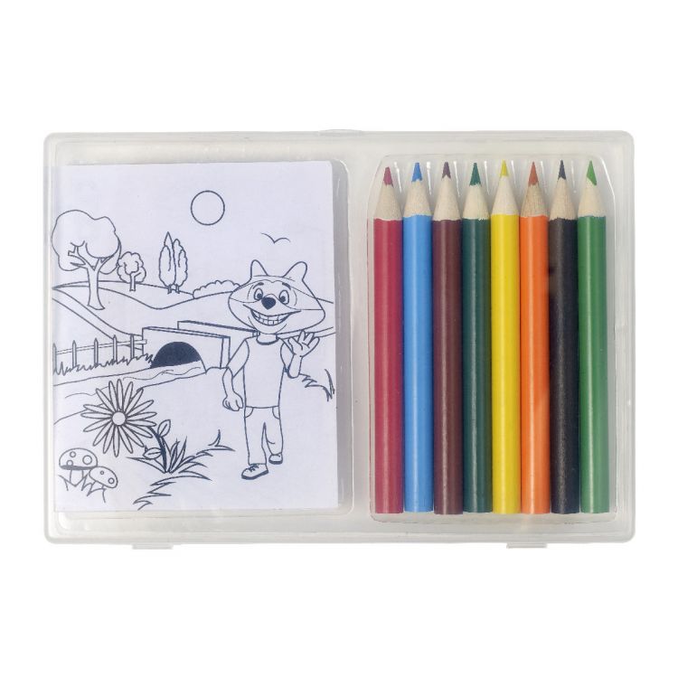 Buntstiftset mit 8 Stiften (Rot, Schwarz, Gelb, Blau, Hellgrün, Dunkelgrün, Orange, Dunkelrot) und 20 Motiven zum Ausmalen in transparenter Kunststoffbox.