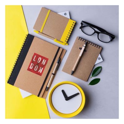 NotizbuchRingbuch aus stabilem zweifarbigem Recyclingkarton mit weichem Einband, Gummizug und passendem Stift aus Recyclingkarton. In kräftigen Farben.