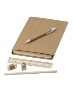 Büro-SetBüro-Set aus Karton mit einem Notizblock (160 linierte Seiten), 6 Haftnotizsätzen (mit je 25 Blatt), einem 12cm langen Lineal, einem Kugelschreiber, einem Visitenkartenfach und einer Abdeckung mit Gummiband, in natürlich farbe