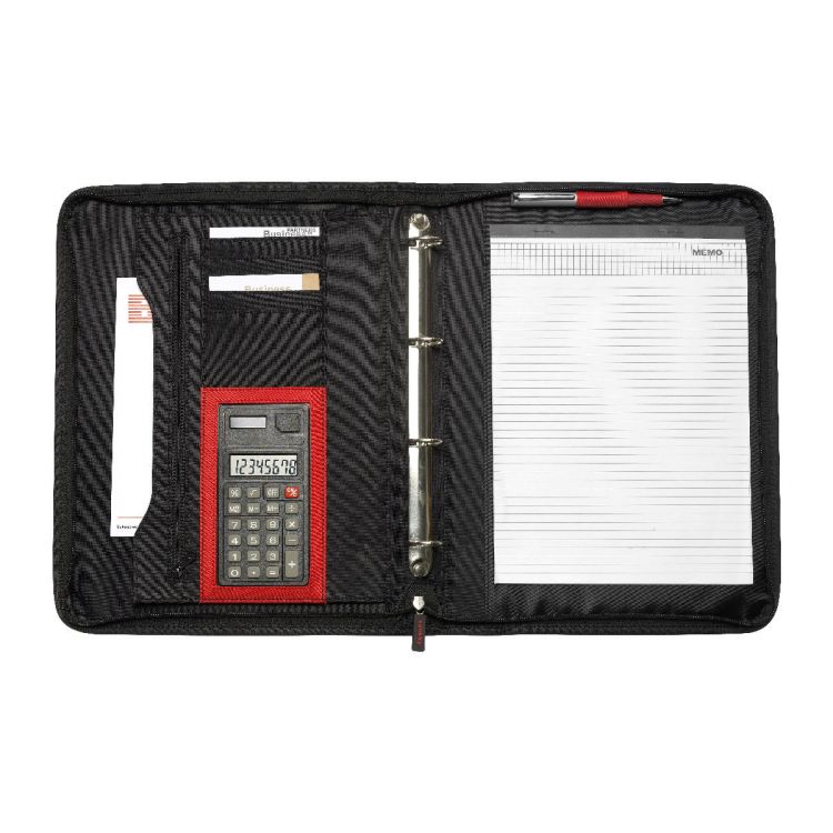 Dokumentenmappe aus Nylon (70D), ca. DIN A4-Format, mit 2 RV-Fronttaschen, Tragegriff, 7 Einsteckfächern, Stifthalter (ohne Stift), Ringbucheinsatz, Dual-Power-Taschenrechner.