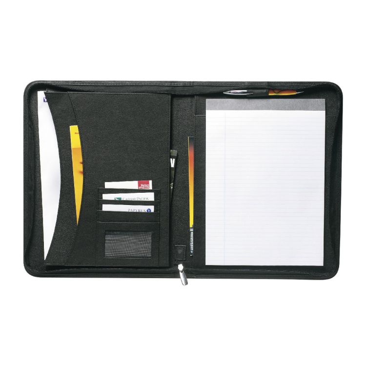 Dokumentenmappe aus Kunstleder, ca. DIN A4-Format, mit Reißverschluss, Stifthalter (ohne Stift), 8 Einsteckfächern, Schreibblock (liniert) und Metallplätchen für Gravuren.