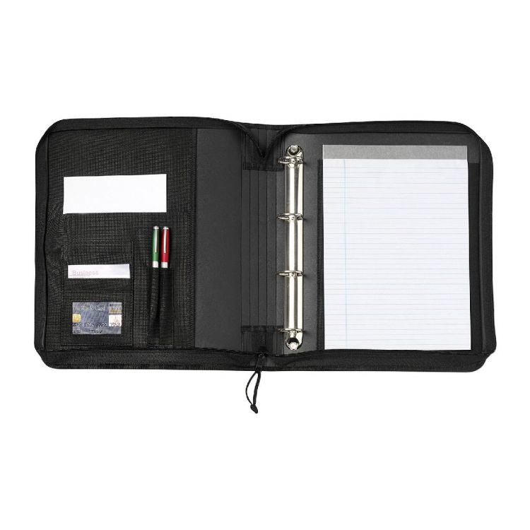 Dokumentenmappe aus 600D Polyester/PU, ca. DIN A4-Format, mit Reißverschluss, Tragegriff, Register, 7 Einsteckfächern, Ringbucheinsatz, 2 Stifthaltern (ohne Stifte) und Schreibblock (liniert).