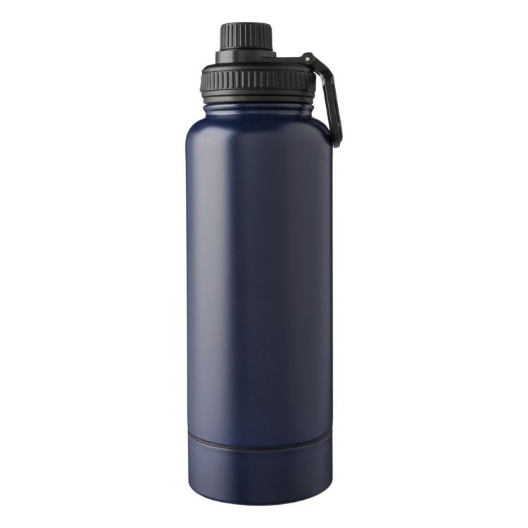 Doppelwandige Trinkflasche aus Edelstahl (1000 ml). Mit PP-Deckel mit Schraubspender und Trageschlaufe. Im Boden befindet sich ein kleines aufschraubbares Fach zur Aufbewahrung. Das Innere der Flasche besteht aus Edelstahl 304, das Äußere aus Edelstahl 201. Einzeln verpackt in einer braunen Pappschachtel.