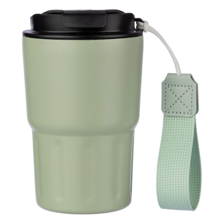 Doppelwandiger Trinkbecher aus pulverbeschichtetem Edelstahl (320 ml). Innen aus Edelstahl 304 und außen aus Edelstahl 201. Seitlicher Tragegurt und Deckel aus PP. Einzeln verpackt in brauner Kartonverpackung.