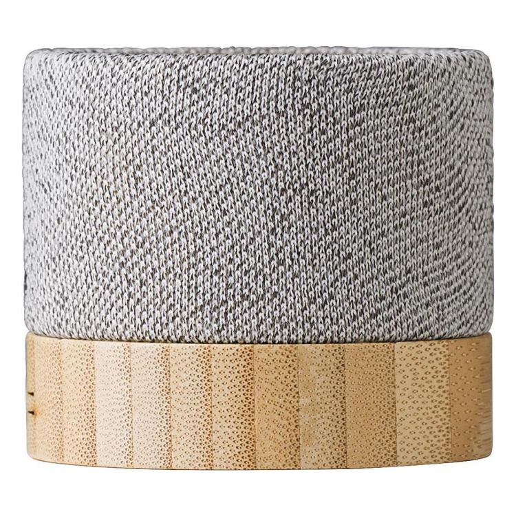 Kabelloser Bambus-Lautsprecher mit rPET-Details. Akku-Kapazität 300 mAh mit 3W USB-C-Ladekabel enthalten. Einzeln verpackt in einer braunen Kartonbox, in grau farbe