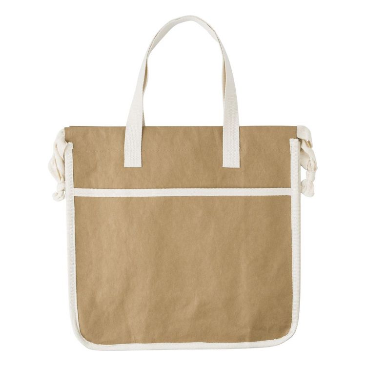 Waschbare Einkaufstasche aus Kraftpapier mit TC-Futter (250 gr/m²). Mit zwei kurzen Henkeln und zwei Schnüren zum Verschnüren der Tasche, in braun farbe