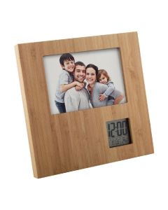 Wetterstation aus BambusWetterstation aus Bambus mit Fotorahmen. Funktionen: Uhr, Temperatur und Luftfeuchtigkeit. Geeignet für Fotos im Format 9x14cm. Fotoformat 15 x 10 cm. Inklusive Batterien, in braun farbe