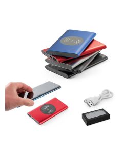 Powerbank 4'000 mAh mit 5W wireless Ladegerät aus Recyceltes Aluminium (100 % rAL)Powerbank mit wireless Ladefunktion aus Recyceltes Aluminium (100 % rAL). Tragbarer Akku mit 4.000 mAh Kapazität, Ladestandsanzeige, einem USB-C-Eingang, einem USB-A-Ausgang und 5 W kabelloser Ladeleistung. Kompatibel mit mobilen Geräten mit kabelloser Ladetechnologie. Enthält ein USB-C-Ladekabel. Wird in einer Geschenkbox geliefert