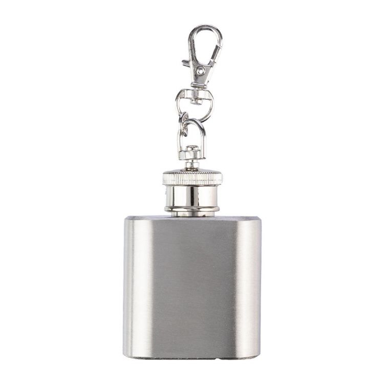 Flachmann aus Edelstahl (s/s304) (30 ml) mit Karabiner-Schlüsselanhänger. Verpackt pro Stück in einer braunen Kartonbox.