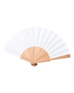 FächerFächer aus unserer Naturlinie mit Holzrippen und Gewebe aus RPET-Material, das aus recyceltem Kunststoffmaterial gewonnen wird, um die Wiederverwendung von Kunststoffresten zu fördern und zur Nachhaltigkeit der Erde beizutragen. Präsentiert in einer individuellen, umweltfreundlichen Design-Box. (weiß farbe)