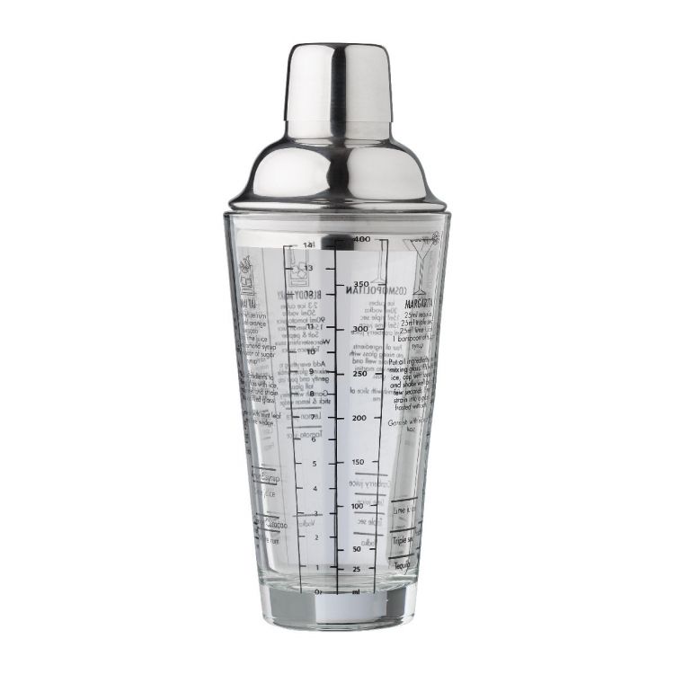 Cocktailshaker aus Glas (400 ml) mit Deckel aus Edelstahl (s/s304). Cocktailrezepte auf der Seite aufgedruckt. Einzeln verpackt in einer braunen Kartonbox.