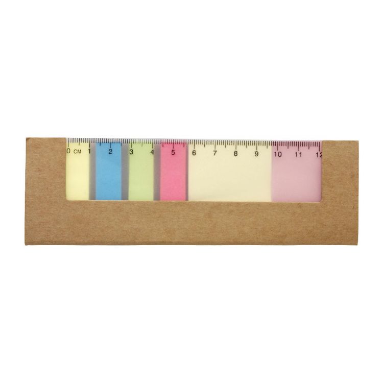 Haftnotizen-Set inklusive Lineal aus Kunststoff, 5x 25 Haftnotizen im kleinen Format und 2x 25 im großen Format.