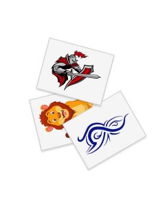 HiGift bietet Ihnen eine große Auswahl an personalisierten temporären Tattoos zum selbst gestalten, die sich in Formen und Farben unterscheiden. Die nachgefragtesten Größen für die personalisierten temporären Tattoos sind: 50x50mm und 63x38mm aber wir können andere Formaten umsetzen.