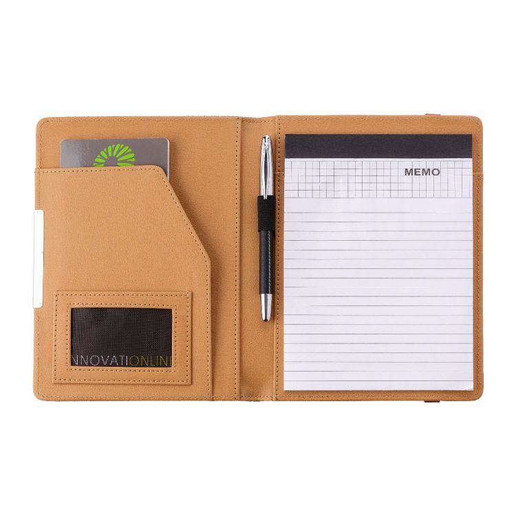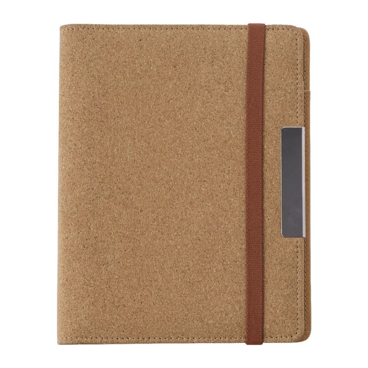 Konferenzmappe aus Kork, ca. DIN A5-Format, mit 2 Einsteckfächern, Stifthalter, inklusive Verschlussband und Schreibblock (20 linierte Blätter, etwas kleiner als DIN A5) Format.