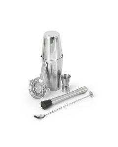 Cocktail-Set aus Edelstahl bestehend aus 6 TeilenCocktail-Set aus Edelstahl bestehend aus 6 Teilen: ein Mixbecher (600 + 450 mL), ein Dosierbecher (30 mL), ein Löffel, ein Pistill und ein Sieb. Inklusive einem Non-Woven-Beutel. Geliefert in einer Geschenkschachtel. Produkt in silber farbe