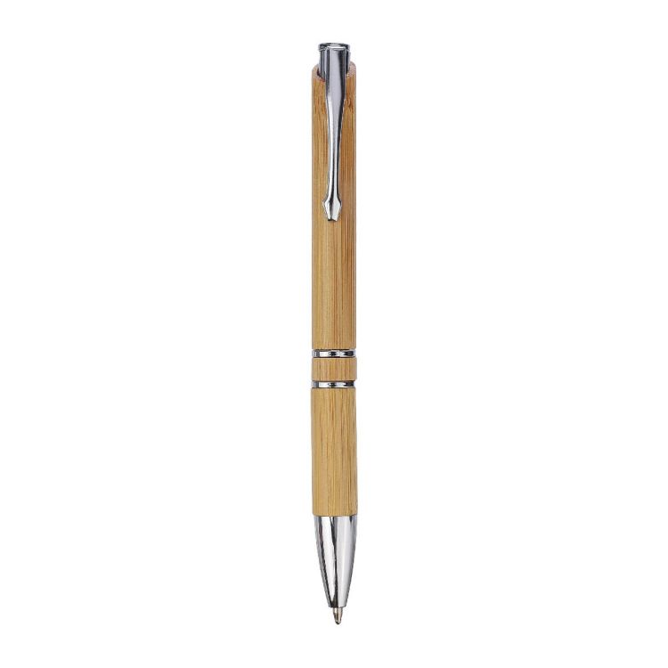 Kugelschreiber aus Bambus mit verchromten Metalldetails und Druckknopf. Ringe, Druckknopf und Spitze aus Kunststoff.Clip aus Metall. Ca. 800 Meter Schreiblänge. Schwarze Tinte.