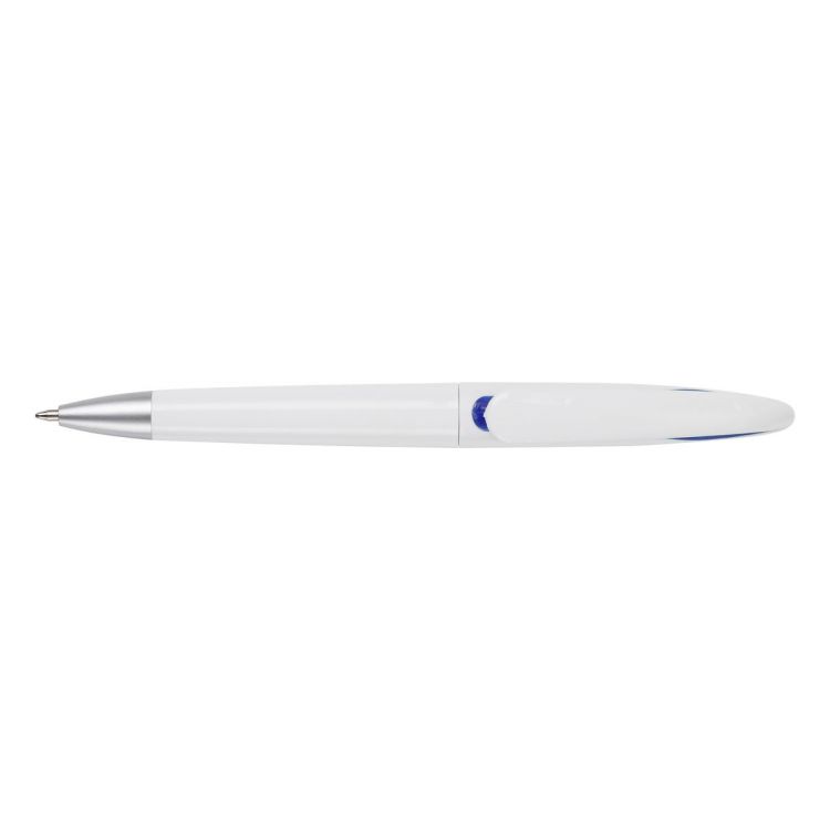 Drehkugelschreiber aus Kunststoff, weiß mit farbigen Akzenten und schwarzer Mine.