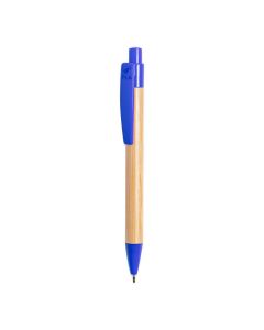 Bambus-KugelschreiberBambus-Kugelschreiber mit Kunststoffclip und -spitze, blauschreibend.