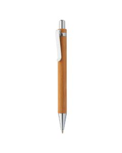Bambus-KugelschreiberKugelschreiber aus Bambus mit aluminiumfarbenen Details. Clip und Spitze aus Graphit, mit Bambusdetails an der Spitze. Blaue Tinte.
