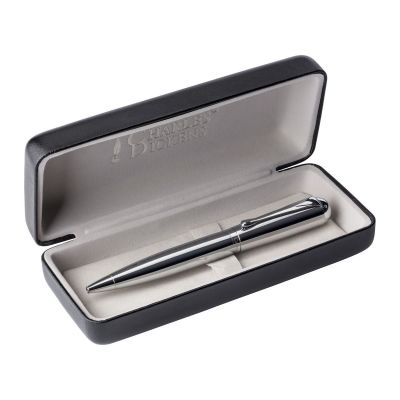 Kugelschreiber-SetElegantes Metall-Schreibset mit verchromten Elementen, bestehend aus Kugelschreiber (blauschreibend) und Rollerball. Einzeln in Kunstleder-Etui. André Philippe Markenprodukt