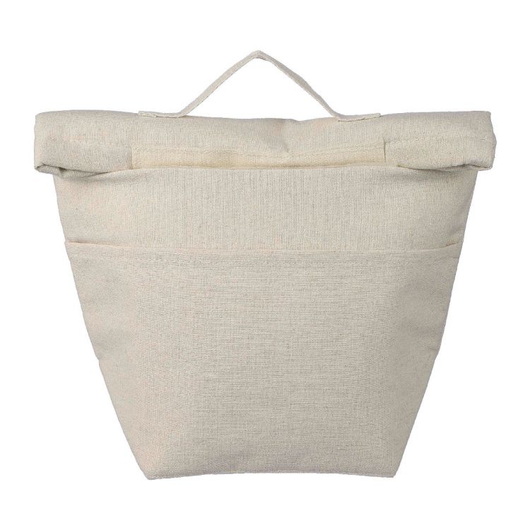 Rolltop-Kühltasche aus recycelter Baumwolle (220 g/m2) mit 3 mm EPE und 12C PEVA-Innenfutter. Mit Klettverschluss, kleiner Fronttasche und kurzem Trageriemen oben. Inklusive Recycelte-Baumwolle-Etikett auf der Außenseite.