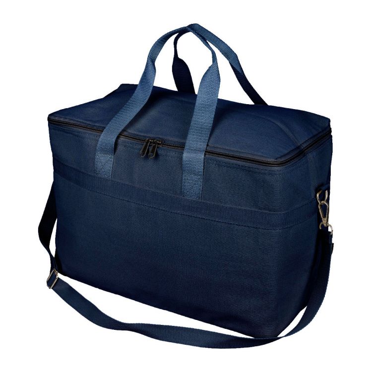 Kühltasche aus recyceltem Polycotton (330 g/m²) mit 23 Liter Fassungsvermögen. Mit zwei Tragegriffen (3,5 × 60 cm), einem verstellbaren Schultergurt (2,5 × 110 cm) mit Metallschnalle und passendem Gurtband. Isoliert mit Aluminiumfolie. Mit rPET-Etikett außen und einem Etikett innen.