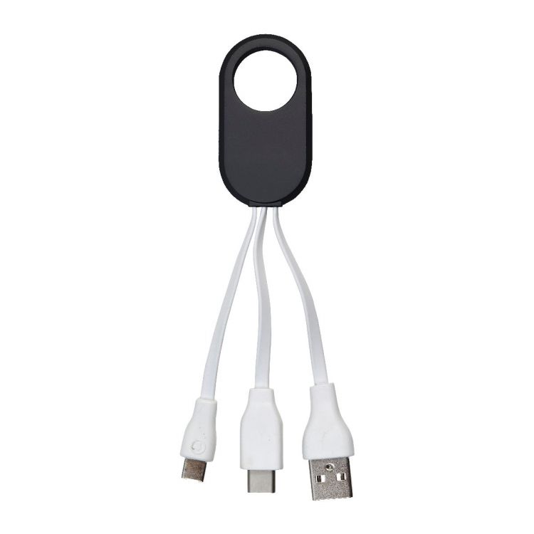Ladekabelset mit USB, USB-C und Lightning Kabel. Jedes Kabel ist ca. 7 cm lang.
