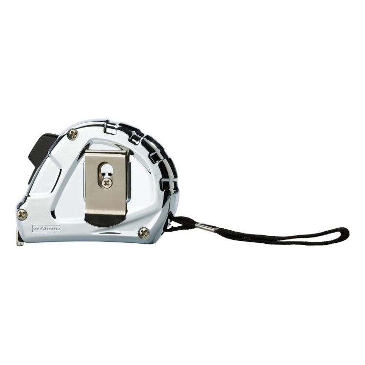 Maßband aus Kunststoff, Messbereich 3 m, mit Handschlaufe, Feststeller und Gürtelclip.