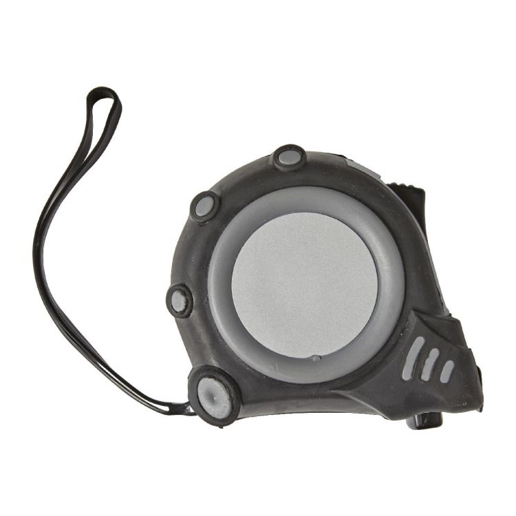 Maßband aus Kunststoff, Messbereich 5 m, kalibriert, mit Zentimetereinheiten und Inches, Handschlaufe, Feststeller und Gürtelclip.