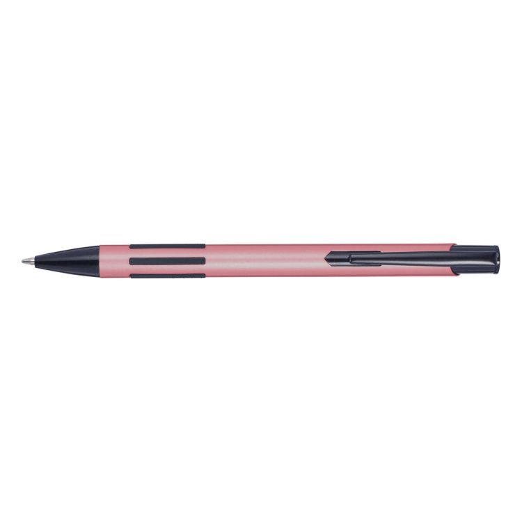 Kugelschreiber aus Metall, lackiert mit Druckknopf. Der Clip, Druckknopf und die Spitze sind schwarz lackiert, und passend zu den gummierten Anti-Rutsch-Elementen. Minenfarbe ist Blau.