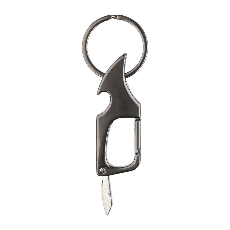 Schlüsselanhänger mit Metallkarabiner, Flaschenöffner und kleinem Messer. Das Metall des Schlüsselanhängers ist verzinkt. Einzeln verpackt in einer braunen Papiertüte.