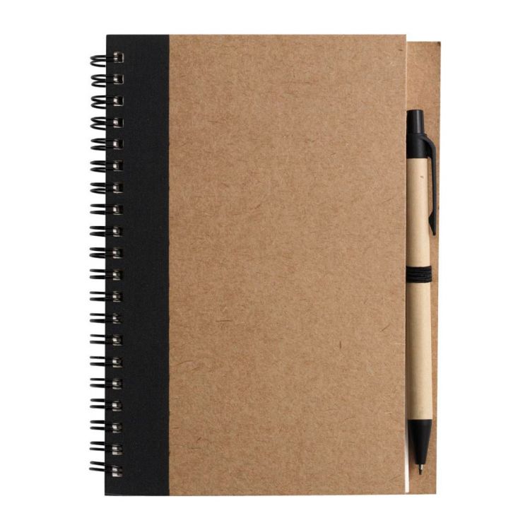 Notizbuch aus recyceltem Papier mit Ringbindung und farbigen Applikationen mit 60 linierten Seiten inkl. Kugelschreiber aus Karton/Kunststoff mit blauer Mine.