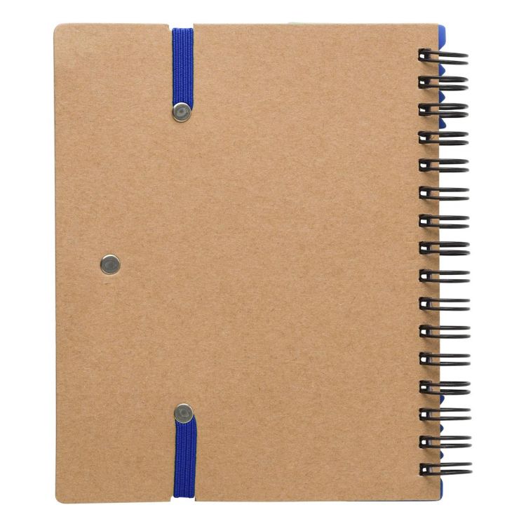 Notizbuch aus recyceltem Papier mit Ringbindung und 60 linierten Seiten. Haftnotizen in 5 Farben, Lineal und einem Rollerball.