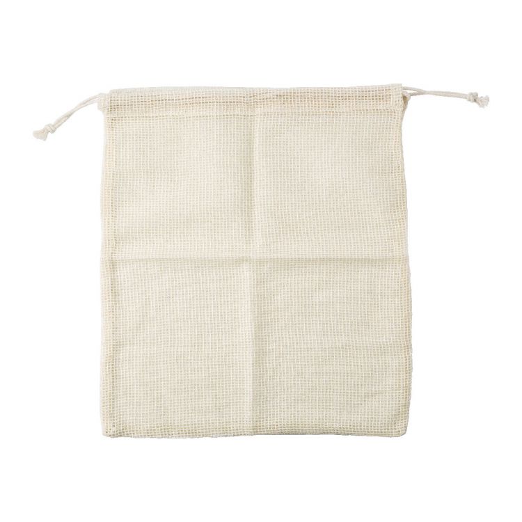 Obst- und Gemüsebeutel aus 100% Bio-Baumwolle mit einseitigem Netzgewebe und Kordelzugverschluss.