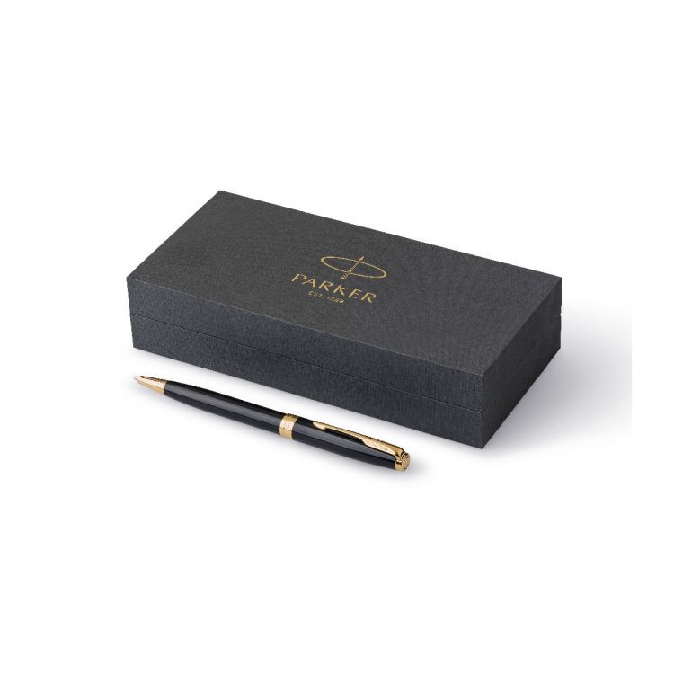 Parker Drehkugelschreiber Sonnet Schaft und Kappe aus Edelstahl, akzentuiert durch Clip und Zierleiste in Goldoptik. Schreibfarbe: schwarz. Verpackt in einer Geschenkbox.