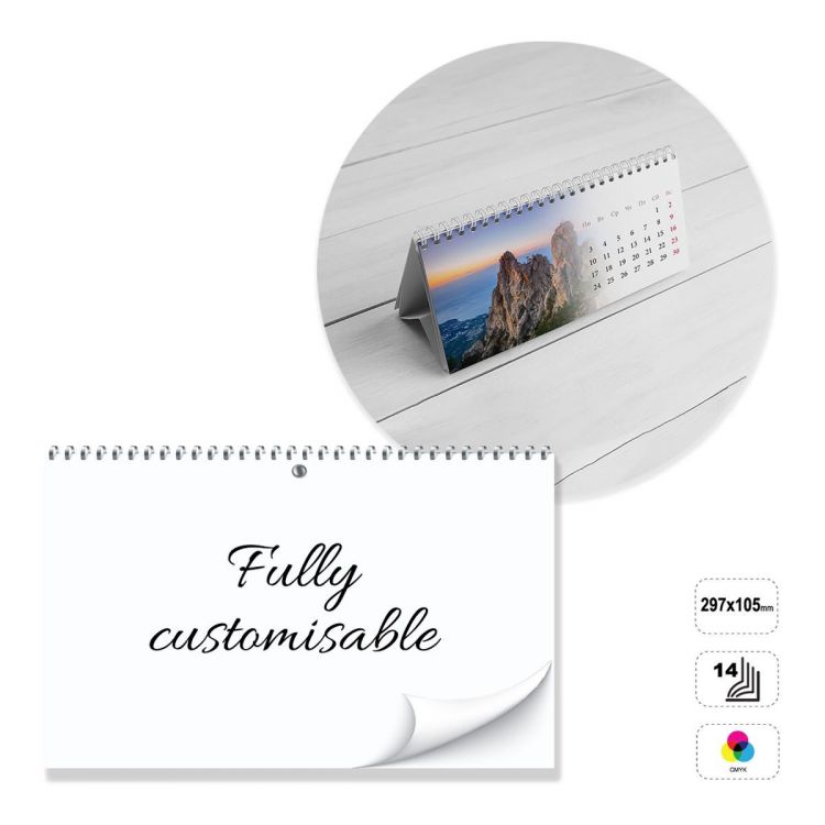 Horizontaler Tischkalender, vollständig individuell gestaltbar. Das Produkt besteht aus 14 Blättern aus matt gestrichenem 135-Gramm-Papier, bedruckbar auf der Vorder- oder Vorder- und Rückseite im Vierfarbendruck. Gebunden mit einer silbernen, weißen oder schwarzen Metallspirale am oberen Ende. Nicht bedruckbarer weißer 300-Gramm-Karton als Unterlage. Der Kalender kann durch Abänderung der voreingestellten Vorlage individuell gestaltet werden oder komplett nach den Vorgaben einer neutralen Vorlage erstellt werden.