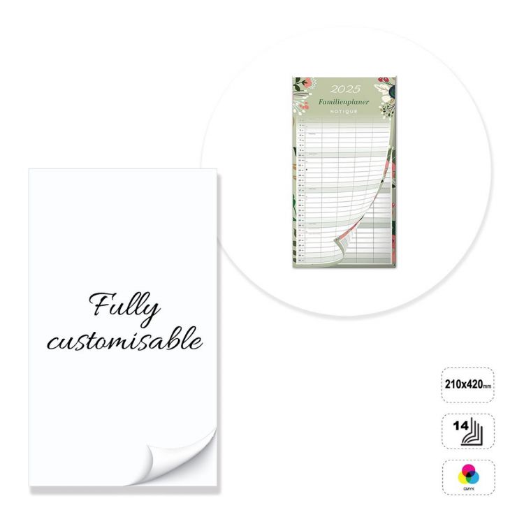 Vertikaler Wandkalender, vollständig anpassbar. Das Produkt besteht aus 14 Blättern aus matt gestrichenem 135-Gramm-Papier, die an der Oberseite mit einem 5 mm-Loch geklebt sind. Das Produkt kann auf der Vorderseite im Vierfarbendruck bedruckt werden. Nicht bedruckbare Rückseite aus weißem 300 g-Karton. Der Kalender kann durch Abänderung der voreingestellten Vorlage individuell gestaltet werden oder komplett nach den Vorgaben einer neutralen Vorlage erstellt werden.