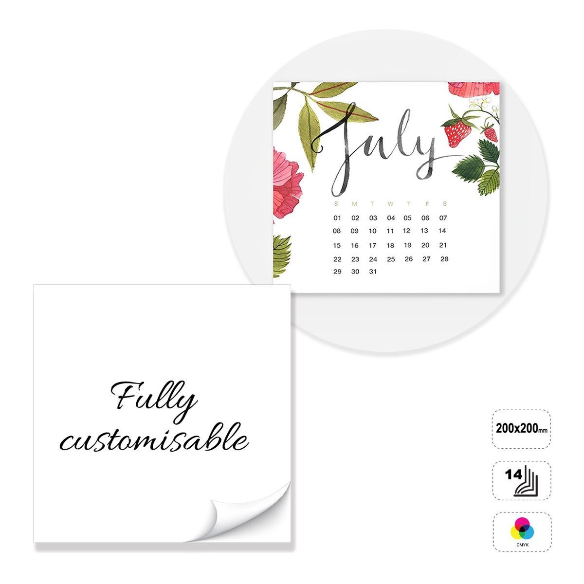 Quadratischer Wandkalender, vollständig anpassbar. Das Produkt besteht aus 14 Blättern aus matt gestrichenem 135-Gramm-Papier, die oben mit einem 5 mm-Loch geklebt sind. Das Produkt kann auf der Vorderseite im Vierfarbendruck bedruckt werden. Nicht bedruckbare Rückseite aus weißem 300 g-Karton. Der Kalender kann individuell gestaltet werden, indem die voreingestellte Vorlage geändert wird, oder er kann komplett nach den Vorgaben einer neutralen Vorlage erstellt werden.