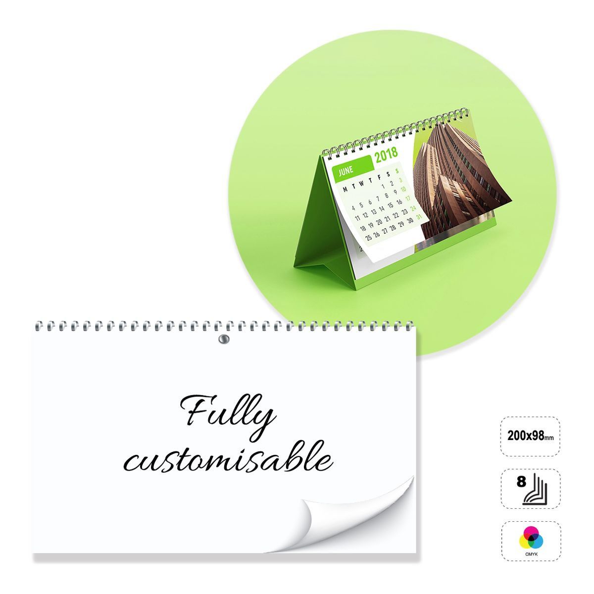 Horizontaler Tischkalender, vollständig individuell gestaltbar. Das Produkt besteht aus 8 Blättern aus matt gestrichenem 135-Gramm-Papier, bedruckbar auf der Vorder- oder Vorder- und Rückseite im Vierfarbendruck. Gebunden mit einer silbernen, weißen oder schwarzen Metallspirale am oberen Ende. Nicht bedruckbarer weißer 300-Gramm-Karton als Unterlage. Der Kalender kann durch Abänderung der voreingestellten Vorlage individuell gestaltet werden oder komplett nach den Vorgaben einer neutralen Vorlage erstellt werden.