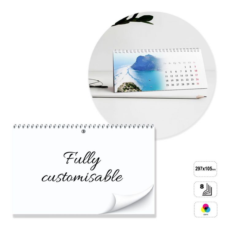 Horizontaler Tischkalender, vollständig individuell gestaltbar. Das Produkt besteht aus 8 Blättern aus matt gestrichenem 135-Gramm-Papier, bedruckbar auf der Vorder- oder Vorder- und Rückseite im Vierfarbendruck. Gebunden mit einer silbernen, weißen oder schwarzen Metallspirale am oberen Ende. Nicht bedruckbarer weißer 300-Gramm-Karton als Unterlage. Der Kalender kann durch Abänderung der voreingestellten Vorlage individuell gestaltet werden oder komplett nach den Vorgaben einer neutralen Vorlage erstellt werden.