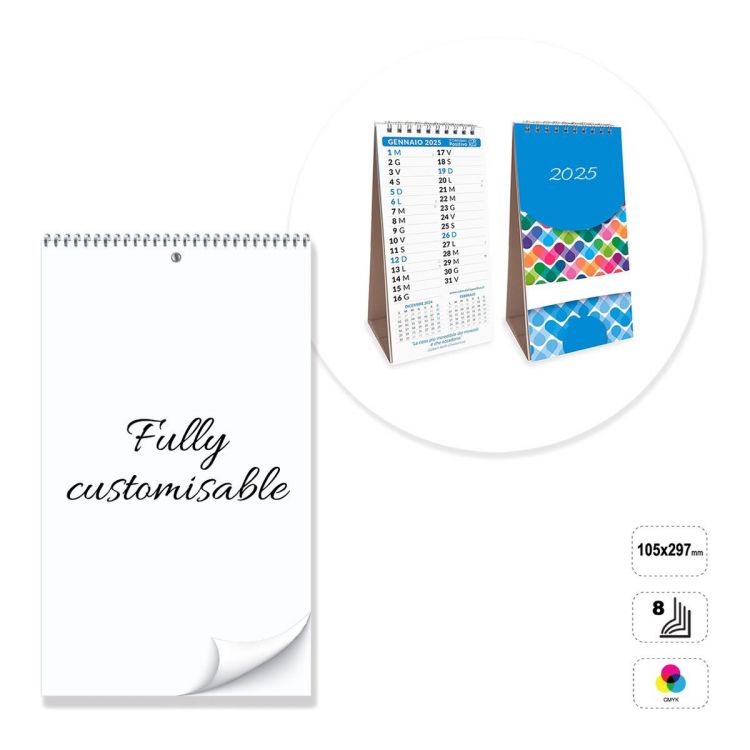 Vertikaler Tischkalender, vollständig anpassbar. Das Produkt besteht aus 8 Blättern aus matt gestrichenem 135-Gramm-Papier, bedruckbar auf der Vorder- oder Vorder- und Rückseite im Vierfarbendruck. Gebunden mit einer silbernen, weißen oder schwarzen Metallspirale am oberen Ende. Nicht bedruckbarer weißer 300-Gramm-Karton als Unterlage. Der Kalender kann individuell gestaltet werden, indem die vorgegebene Vorlage geändert wird, oder er kann komplett nach den Vorgaben einer neutralen Vorlage erstellt werden.