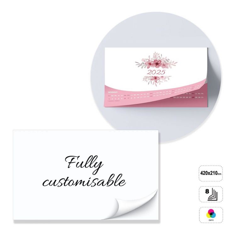 Horizontaler Wandkalender, vollständig anpassbar. Das Produkt besteht aus 8 Blättern aus matt gestrichenem 135-Gramm-Papier, die an der Oberseite mit einem 5 mm-Loch geklebt sind. Das Produkt kann auf der Vorderseite im Vierfarbendruck bedruckt werden. Nicht bedruckbare Rückseite aus weißem 300 g-Karton. Der Kalender kann durch Änderung der voreingestellten Vorlage individuell gestaltet werden oder komplett nach den Vorgaben einer neutralen Vorlage erstellt werden.