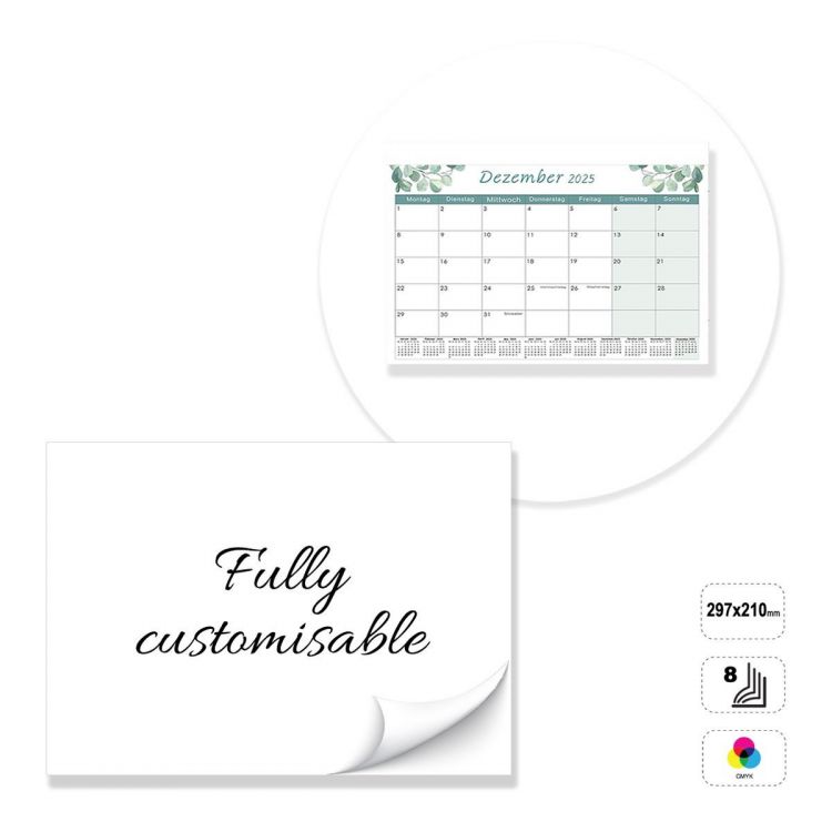 Horizontaler Wandkalender, vollständig anpassbar. Das Produkt besteht aus 8 Blättern aus matt gestrichenem 135-Gramm-Papier, die an der Oberseite mit einem 5 mm-Loch geklebt sind. Das Produkt kann auf der Vorderseite im Vierfarbendruck bedruckt werden. Nicht bedruckbare Rückseite aus weißem 300 g-Karton. Der Kalender kann durch Änderung der voreingestellten Vorlage individuell gestaltet werden oder komplett nach den Vorgaben einer neutralen Vorlage erstellt werden.