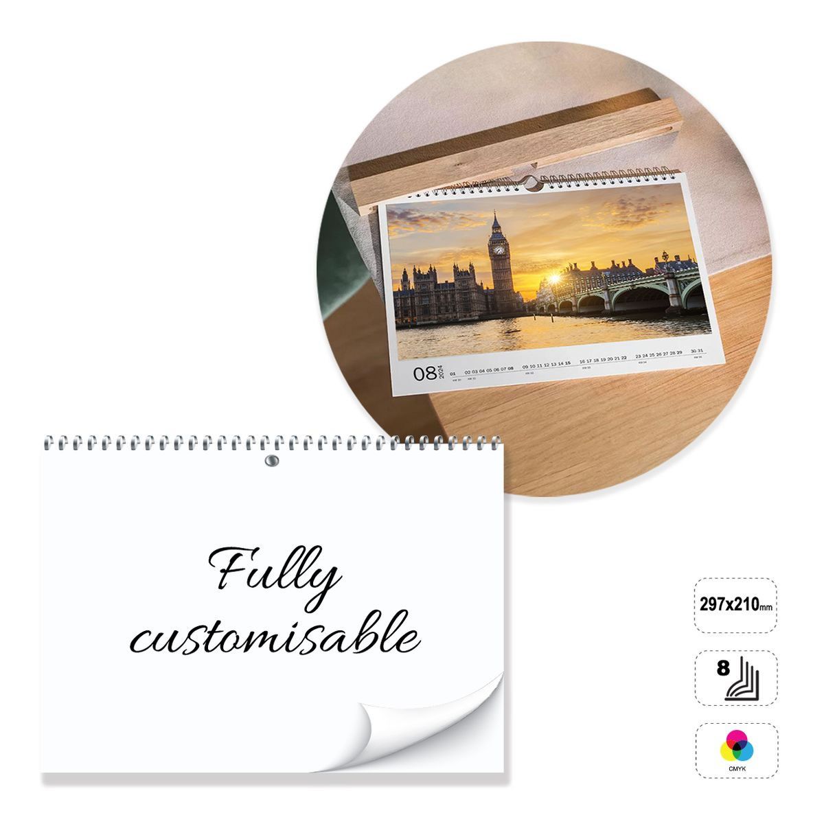 Horizontaler Wandkalender, vollständig anpassbar. Das Produkt besteht aus 8 Blättern aus matt gestrichenem 135-Gramm-Papier, bedruckbar auf der Vorder- oder Vorder- und Rückseite im Vierfarbendruck. Gebunden mit einer silbernen, weißen oder schwarzen Metallspirale am oberen Ende. Nicht bedruckbarer weißer 300-Gramm-Karton als Unterlage. Der Kalender kann durch Änderung der voreingestellten Vorlage individuell gestaltet werden oder komplett nach den Vorgaben einer neutralen Vorlage erstellt werden.