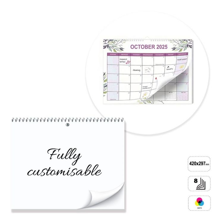 Horizontaler Wandkalender, vollständig anpassbar. Das Produkt besteht aus 8 Blättern aus matt gestrichenem 135-Gramm-Papier, bedruckbar auf der Vorder- oder Vorder- und Rückseite im Vierfarbendruck. Gebunden mit einer silbernen, weißen oder schwarzen Metallspirale am oberen Ende. Nicht bedruckbarer weißer 300-Gramm-Karton als Unterlage. Der Kalender kann durch Änderung der voreingestellten Vorlage individuell gestaltet werden oder komplett nach den Vorgaben einer neutralen Vorlage erstellt werden.